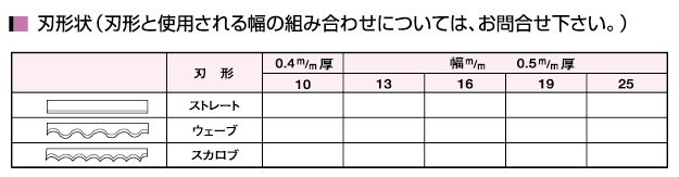 スカロブ・ウェーブ刃形=通称刃形で、上記の材質で梢々密な材料や更に密度の高い材料の加工に適し、切粉やゴミ、ホコリがでないで滑らかに切断ができます。